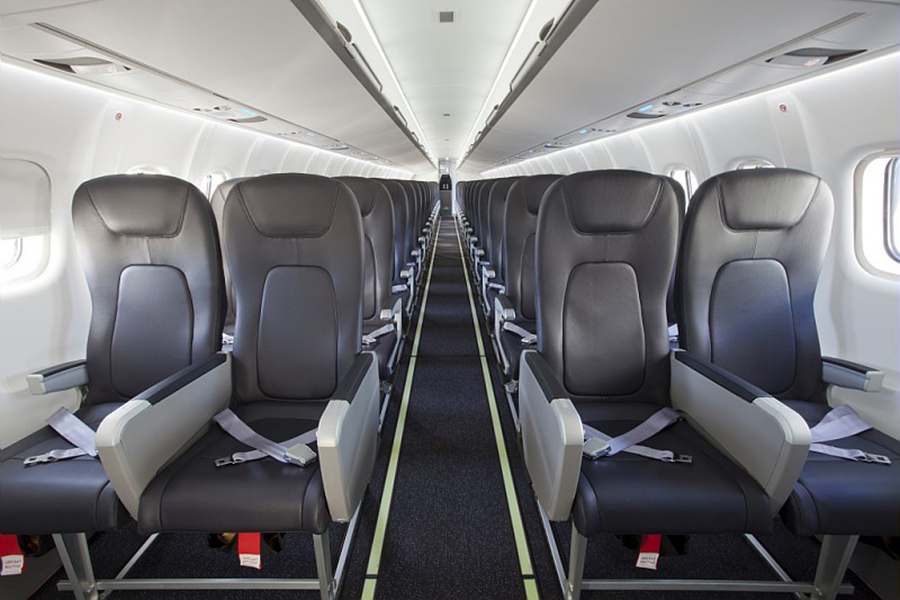 Het vliegtuig kan tot 74 stoelen hebben en is geconfigureerd met twee stoelen links van het gangpad en twee stoelen rechts. De stoelen zijn breed en hebben bagageruimte onder de stoelen. De cabine bevat een aparte pantry en wasruimte.